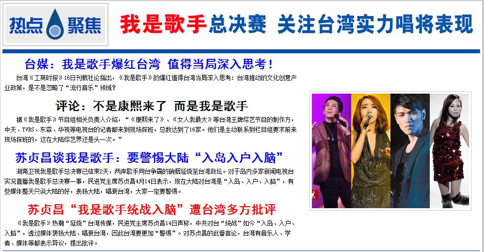 《我是歌手》總決賽,4名臺灣唱將引發(fā)島內廣泛關注,多家電視臺也因此予以大篇幅報道。(圖片來源:中國臺灣網(wǎng))