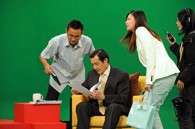 馬英九(左2)10日在臺北壹電視接受專訪。圖為電視臺工作人員在專訪前進(jìn)行最后確認(rèn)。圖片來自:臺灣“中央廣播電臺”