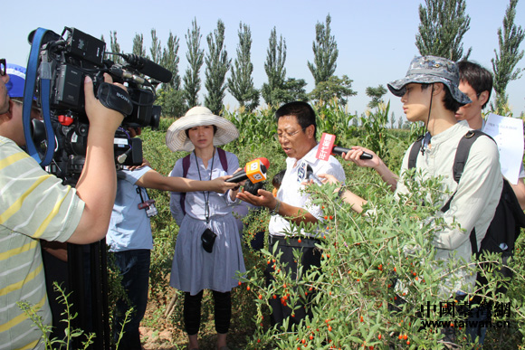 中寧縣領導向兩岸記者介紹中寧枸杞種植情況。(中國臺灣網 王文英 攝)