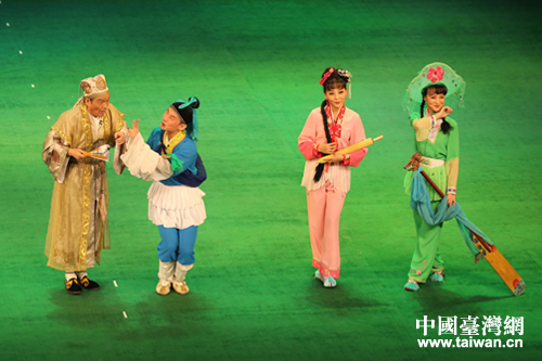 贛南采茶戲《搭船巧遇》受到觀眾的熱情歡迎。《搭船巧遇》是大型傳統采茶戲《茶童哥》中的一折,主要講述了一個聰明伶俐的仆人如何戲弄貪財好色的主人的故事。(中國臺灣網 郜利敏 攝)