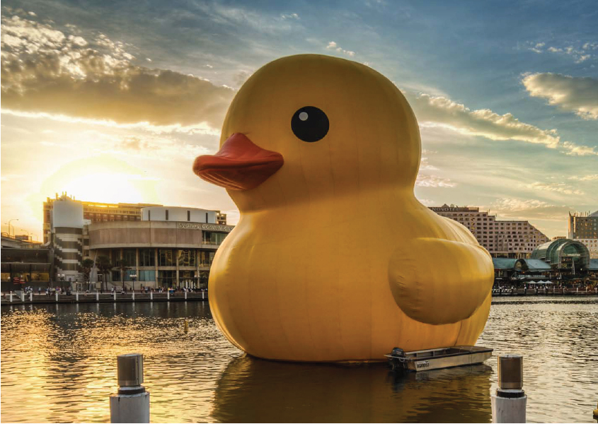 小鴨浮臺(tái)是一座圓形金屬結(jié)構(gòu),外圈直徑15米,由4只大型浮管提供浮力,支撐18米高、1噸重的黃色小鴨;舴蚵鼘(duì)于浮臺(tái)技術(shù)要求很高,浮臺(tái)外圈與海平面的高低落差要控制在1到3公分,因此在浮力計(jì)算上必須精確。