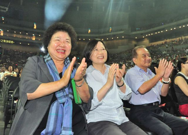 高雄市長陳菊(左)、民進黨前主席蔡英文觀賞詹雅雯演唱會。(圖片來自臺媒)