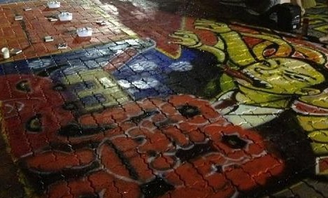 民眾彩繪臺當局“內政部”廣場,右邊為一個張牙舞爪的政客,左邊則是一臺被被稻穗層層纏住的怪手,象征農民抗爭最終讓臺當局停止了浮濫征收。(圖片來自臺媒)
