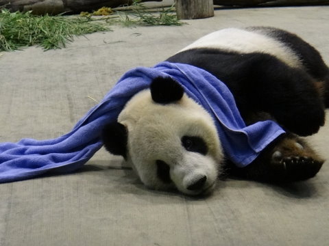每天大熊貓館開館時(shí),團(tuán)團(tuán)早就已經(jīng)帥帥的準(zhǔn)備好要打卡上班了。為了不讓團(tuán)團(tuán)無(wú)聊,一下子就找到食物,保育員會(huì)將一些食物吊掛在高處或藏在假洞里讓它花時(shí)間尋找;偶而會(huì)給團(tuán)團(tuán)塞有葡萄的碎冰讓它涼一下,或準(zhǔn)備沾有香精的毛巾,讓團(tuán)團(tuán)放松的玩耍,這時(shí)候會(huì)看到團(tuán)團(tuán)對(duì)有味道的毛巾一下子又拉又扯,一下子圍在頭上,像在做毛巾運(yùn)動(dòng)操一樣,滑稽的模樣非常有趣。