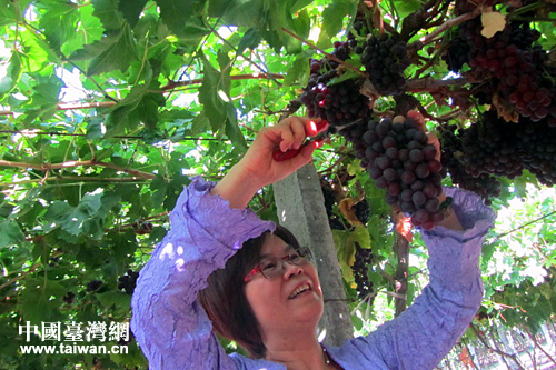 參訪團成員在兵農葡萄莊園體驗采摘。(中國臺灣網 王偉 攝)