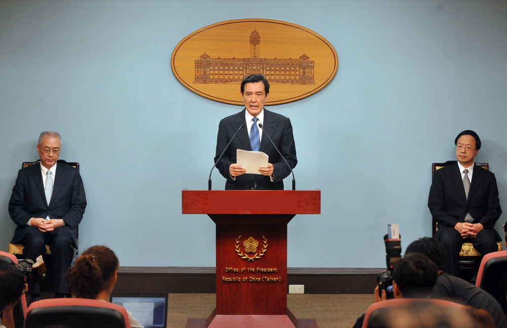 馬英九9月8日在其官邸召開記者會,稱王金平涉入司法關(guān)說案是臺灣民主法治發(fā)展上“恥辱的一天”,作為臺灣地區(qū)領(lǐng)導(dǎo)人,他無從回避,必須挺身而出,捍衛(wèi)臺灣民主法治。左為臺灣地區(qū)副領(lǐng)導(dǎo)人吳敦義、右為臺“行政院長”江宜樺。(圖片取自網(wǎng)絡(luò))