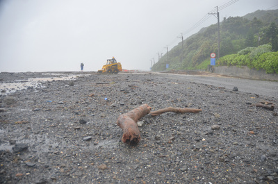 天兔臺(tái)風(fēng)過(guò)境,臺(tái)東大武鄉(xiāng)21日風(fēng)強(qiáng)雨大,大浪夾著漂流木、礁石打上南回公路,公路宛如碎石路,臺(tái)當(dāng)局“公路總局”封閉公路清除。(圖片來(lái)自臺(tái)媒)