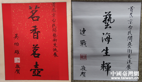 很多臺灣同胞到大陸來,都會到老舍茶館感受一下京味文化的魅力,連戰曾專程到老舍茶館品茗賞戲。圖為連戰和吳伯雄為此次展覽書寫的賀詞。(中國臺灣網 楊永青 攝)