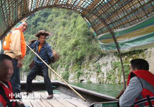 小小三峽上,臺灣記者表演艄公姿勢。(中國臺灣網 段雯婷 攝)