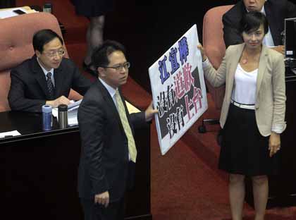 據臺灣媒體報道,臺“立法院”今天上午“國是論壇”結束后,民進黨“立委”聚集在發言臺前高喊抗議江宜樺的口號。“立委”邱志偉、邱議瑩拿著“沒有道歉,沒有上臺”標語,站在江宜樺位子前,江宜樺依舊自顧處理公文,偶爾抬頭看一下場內狀況。