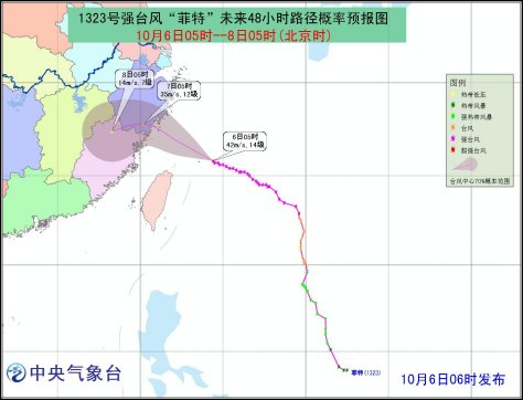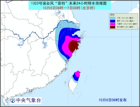 中國(guó)臺(tái)灣網(wǎng)10月6日消息 中央氣象臺(tái)6日早6時(shí)發(fā)布臺(tái)風(fēng)紅色預(yù)警,受今年第23號(hào)強(qiáng)臺(tái)風(fēng)“菲特”影響,未來(lái)24小時(shí),我國(guó)釣魚(yú)島附近海域、東海大部海域、臺(tái)灣以東洋面、臺(tái)灣海峽、南海東北部、巴士海峽以及臺(tái)灣東部和北部沿海,福建、浙江等地有大風(fēng),江蘇安徽南部、上海、浙江、江西東北部、福建東北部、臺(tái)灣北部等地有大雨或暴雨,其中臺(tái)灣北部、浙江中東部和南部有大暴雨。