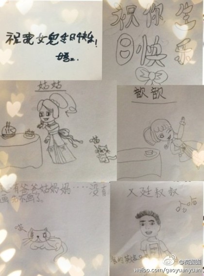 中國臺灣網10月6日消息 據臺灣媒體報道,10月5日是大陸女星高圓圓34歲生日,她在微博上傳一張小朋友祝福她生日快樂的畫作,焦點是畫中主角“又廷叔叔”。