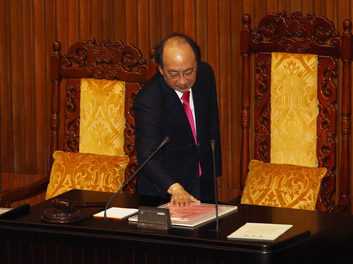 “立法院院會”今早經表決以59票贊成通過由國民黨提出的議程草案,隨后議事人員開始宣讀由民進黨黨團總召柯建銘等43人對江宜樺提出的不信任案內容。數十名民進黨“立委”在“倒閣案”宣讀時持布條抗議,并大喊“江宜樺下臺”口號。