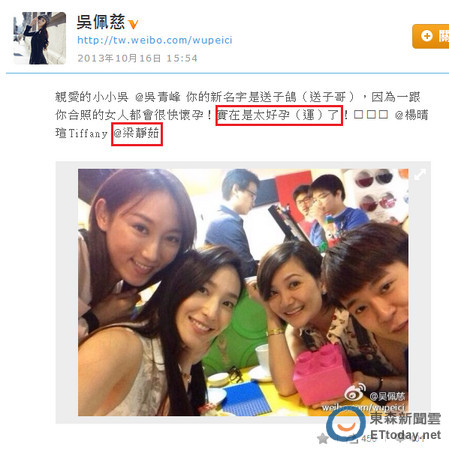 梁靜茹與美籍華裔商人趙元同結(jié)婚3年,兩人婚姻幸福美滿,但一直沒(méi)有傳出懷孕的消息。吳佩慈16日和一群好姐妹吃飯,在場(chǎng)還有蘇打綠主唱青峰,她在微博上直指他是“送子哥”,笑稱(chēng):“因?yàn)橐桓愫险盏呐硕紩?huì)很快懷孕!實(shí)在是太好孕(運(yùn))了!”并放上和梁靜茹與楊晴瑄的4人合照。