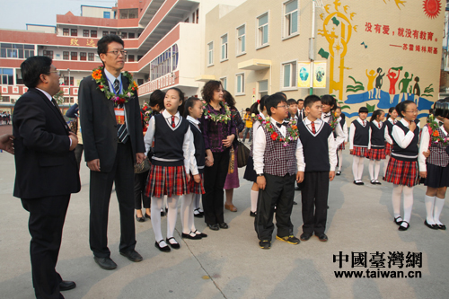 臺灣曹公小學校長彭連煥帶領該校師生代表參訪河南省沁陽市實驗小學。(中國臺灣網 扶海濤 攝)