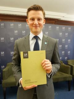 英國(guó)智庫(kù)29日公布2013全球繁榮指數(shù)報(bào)告,臺(tái)灣總排名第22,較去年下跌2名。圖為負(fù)責(zé)繁榮指數(shù)調(diào)查主任甘斯特和報(bào)告。(臺(tái)媒圖)