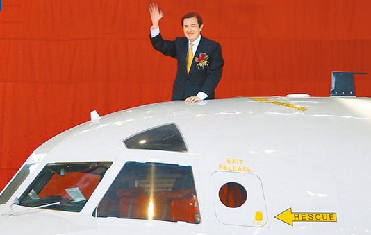 馬英九昨到臺空軍第439混合聯隊主持P-3C反潛機接機典禮。圖為馬從反潛機人員逃生口探出身體,向全場來賓揮手致意。(臺媒圖)