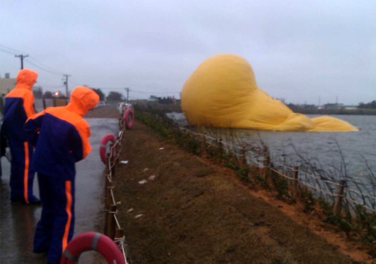 桃園黃色小鴨今早充氣過程中間風力過強,造成鴨體受損。(臺媒圖)
