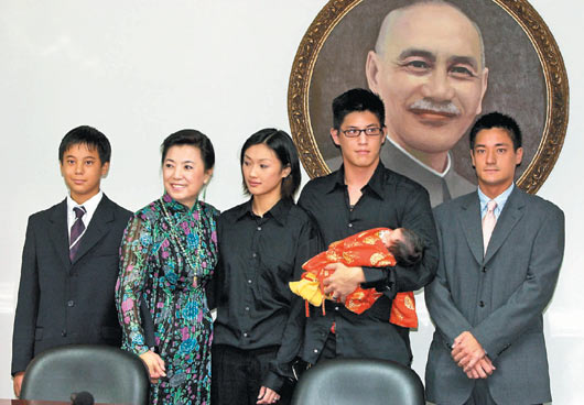 蔣家第四代蔣友青鮮少曝光(左),第五代“小玫瑰”蔣得曦滿月,蔣方智怡(左二)帶著蔣友柏(右二)、媳婦林姮怡(右三)、蔣友常(右一)亮相。(臺(tái)媒圖)