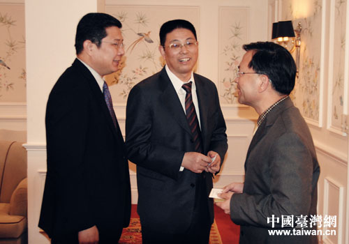 北京市副市長(zhǎng)戴均良(中)11月8日下午會(huì)見由臺(tái)中市副市長(zhǎng)蔡炳坤(右)任名譽(yù)團(tuán)長(zhǎng)的臺(tái)灣文創(chuàng)參訪團(tuán)一行。北京市臺(tái)辦主任汪明浩陪同會(huì)見(左)。(中國(guó)臺(tái)灣網(wǎng)北京市通訊員 郭寧 攝)