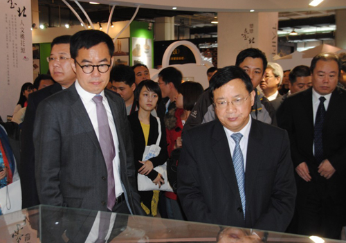 11月7日上午,國臺辦交流局長程金中(前右)在臺北市文化局長劉維公(前左)陪下參觀第八屆文博會臺灣文創精品館。(北京市通訊員 郭寧 攝)