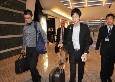 張安薇的哥哥(后)與許立民的二哥(左)準備前往登機。(臺媒圖)