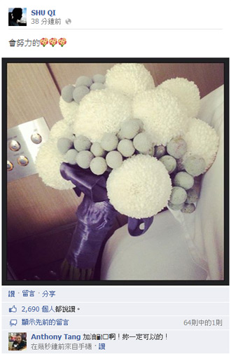 昨晚舒淇步出婚禮派對時,臉上帶著甜蜜笑意說“很開心,看到好朋友嫁出去很開心”,言語透露出舒淇與張震太太莊雯如也是好朋友。舒淇今早還在facebook上曬出捧花照片,并直喊“會努力的”,獲得不少網友按贊,回應她說“幸福在妳身邊”。