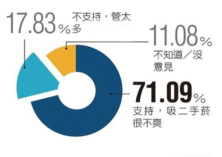 臺媒針對“有民眾抱怨等紅燈常有機(jī)車騎士抽煙,‘衛(wèi)福部’研擬十字路口禁煙,請問你支持嗎?”進(jìn)行民調(diào),460份有效樣本中,有71.09%民眾表示支持,認(rèn)為吸二手煙很不爽;17.83%民眾不支持,認(rèn)為當(dāng)局坑錢、管太多;11.08%民眾沒意見。(中國臺灣網(wǎng) 高旭)
