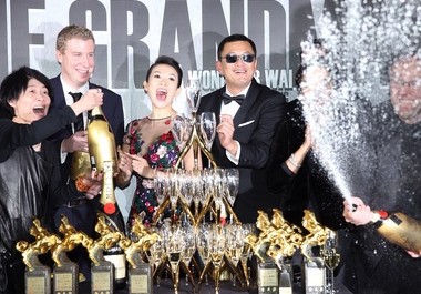 《一代宗師》慶功,章子怡與導演王家衛開香檳慶功。(臺媒圖)