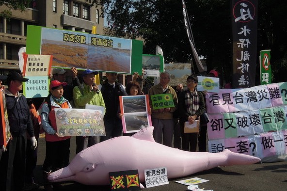 環保團體持“綠牡蠣”批江:說一套、做一套。(臺媒圖)