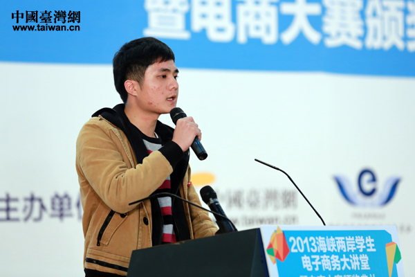 20日下午,由中國臺灣網(wǎng)(m.zhaoqun5.com)、海峽兩岸互聯(lián)網(wǎng)交流委員會、中華臺灣MIT正品推廣協(xié)會主辦的“2013海峽兩岸學(xué)生電子商務(wù)大講堂暨電商大賽頒獎典禮”在京舉行。圖為大陸區(qū)總決賽第一名獲得者分享參賽體會。(中國臺灣網(wǎng) 于斯文 攝)