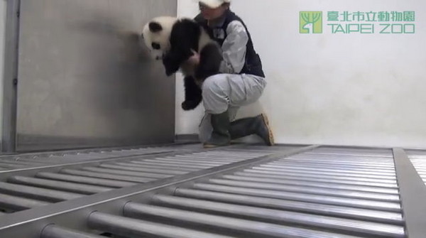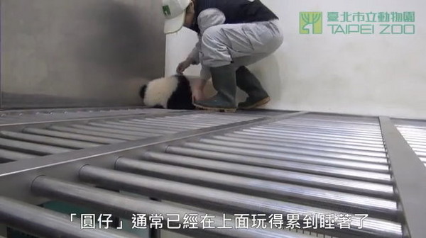 保育員把累得睡著的圓仔救下緩沖籠。(圖/臺(tái)北市立動(dòng)物園)