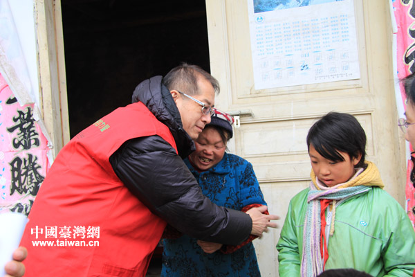 頂新公益基金會(huì)理事長(zhǎng)滕鴻年(右一)帶隊(duì)到留守兒童家中慰問(中國(guó)臺(tái)灣網(wǎng) 李徽 攝)