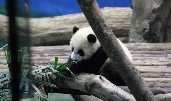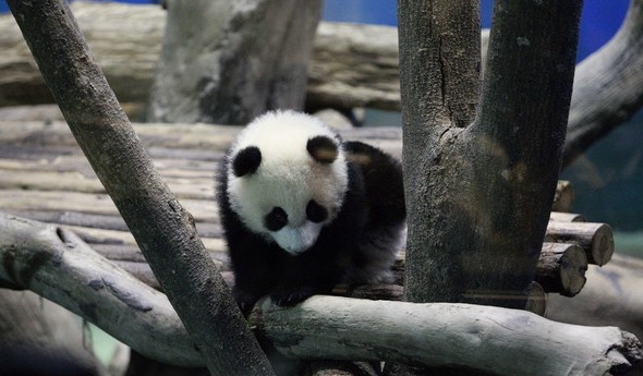 當天傍晚6點,工作人員將出生182天的“圓仔”從房間中抱出,放在由玻璃隔開的展館中供媒體拍攝。與“圓仔”一同出現的還有媽媽“圓圓”。母女倆一起玩耍了一會兒后就分開活動。“圓仔”步伐穩健、能走能爬、活動自如,一會就爬上由樹干搭成的木頭架子,在搖頭晃腦之余還不時舔舔樹干,有時還趴在樹干上休息。