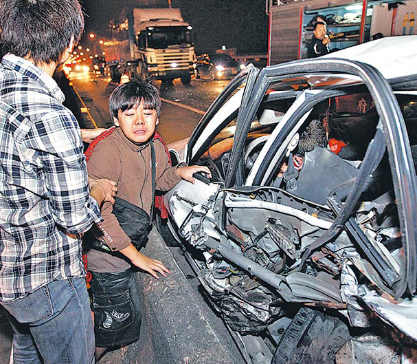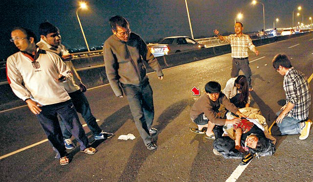 屏東駛往高雄的88快速道路昨日凌晨發(fā)生車禍,一名年長婦女被拋摔在大橋上,她的外孫(箭頭處)不知所措,路人見狀上前幫忙。來自臺媒