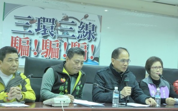 民進黨新北市長候選人游錫堃和議會黨團追打三環三線,批朱立倫騙騙騙最后什么都看不見。(臺媒圖)