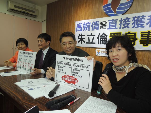 臺聯黨黨團指出,朱立倫妻子高婉倩投資高氏企業、日月高投資及育華投資等3家公司1500萬元至200萬元新臺幣不等,同時還擔任公司監察人,而這3家公司也直接或間接投資威創科技,朱立倫也等同直接獲利,恐已涉及貪瀆。