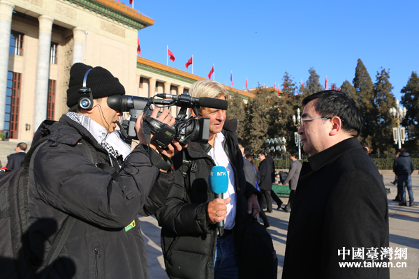 挪威國家廣播電視臺記者采訪全國人大代表。(中國臺灣網 王思羽 攝)