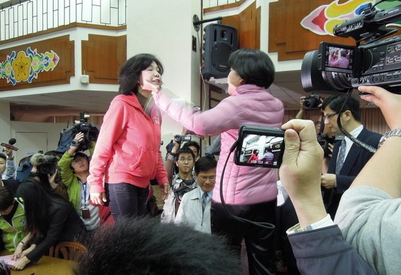 民進黨“立委”葉宜津、國民黨“立委”楊瓊瓔跳上桌子為登記發言順序大吵。(臺媒圖)