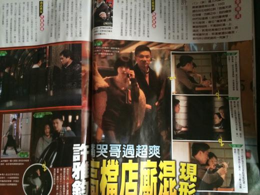 許雅鈞在14日晚間被臺灣《壹周刊》拍到和小S搭著由司機(jī)駕駛的高級休旅車,前往只接待會員預(yù)定的高檔日本料理店,同桌的有紅豆食府千金蔡依倫和林靖倫夫婦,除了享用美食外還開了高檔紅酒,平均消費(fèi)約5500元(新臺幣,下同)。