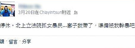 中國臺灣網3月26日消息 據臺灣媒體報道,臺民眾沖擊“行政院”風波造成警民百余人受傷,有警員因不滿休假被召回,在網絡留言直指學生是暴民,甚至貼文“套子我戴了準備被我干爆吧”,遭到肉搜。