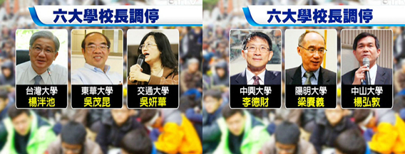 臺灣大學校長楊泮池、中山大學校長楊弘敦、東華大學校長吳茂昆、交通大學校長吳妍華、中興大學校長李德財、陽明大學校長梁賡義等6位公立大學校長27日發表聯合聲明,建議透過不具政黨色彩的公正團體組成溝通平臺,盡快弭平當局與學生雙方的歧見,希望抗議事件早日落幕,讓學生回校園。