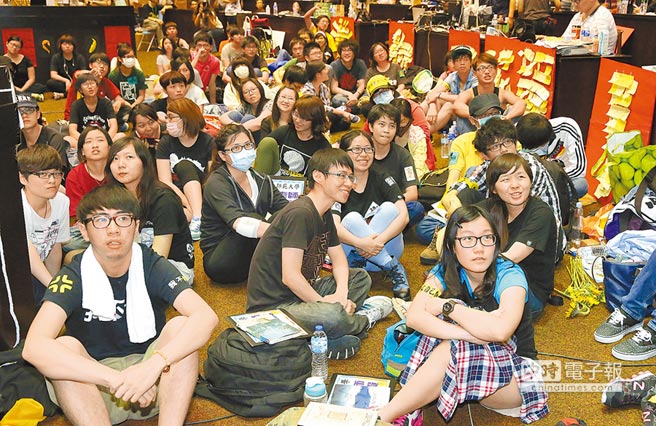 占據議場內的學生29日透過網絡電視收看馬英九記者會(圖片來自臺媒)