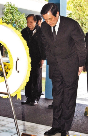 心事重重的馬英九在結束謁陵準備離去,下階梯時,一不留神絆到腳,差點摔跤,幸好隨扈趕忙上前扶住馬英九,馬英九也立即回神穩住,才沒有發生意外。