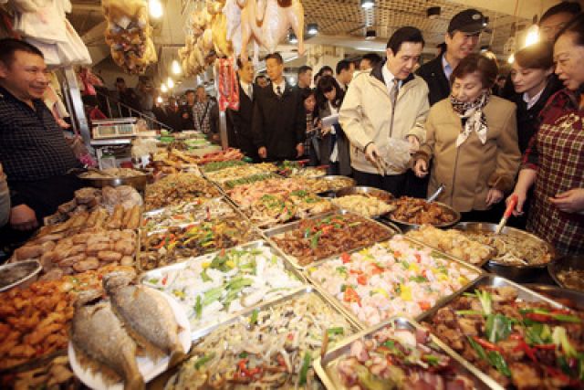 馬英九(前右3)今年2月8日一早陪同母親秦厚修(前右2)前往臺北市興隆市場買年菜。(圖片來自臺媒)
