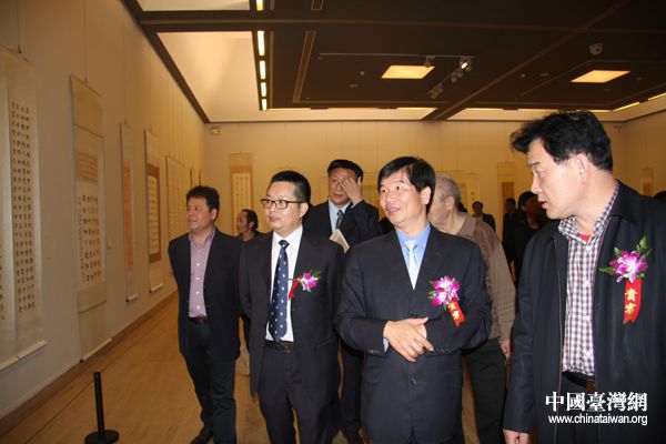 中國臺灣網4月13日北京消息 4月13日下午,以“藝繪兩岸”為主題的“石溪畊硯,翛墨京華——陳志聲書法作品展”開幕式在中國美術館成功舉行。文化部港澳臺辦主任助理、中華文化聯誼會副秘書長李保宗、文化部港澳臺辦臺灣處處長廖冰、中國美術館黨委書記游慶橋、臺灣中國書法家協會理事長陳炫明、臺灣著名書法家陳志聲及其夫人等兩岸書法愛好者共同出席了開幕儀式。