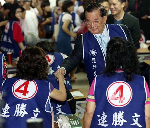 連戰表示,看到志工媽媽們每天只睡4、5個小時,就積極來幫忙打電話,令他非常感動,所以今天專程來當面感謝大家,希望助勝文一臂之力。