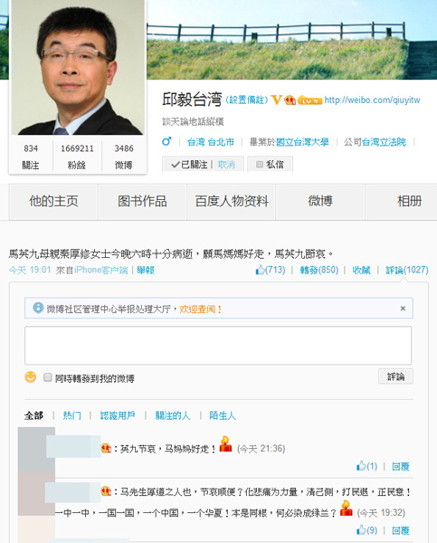 秦厚修病逝,陸網友微博“點蠟燭”哀悼。(圖片取自邱毅微博)