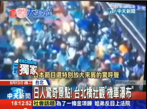 據臺灣《中天新聞》報導,日本節目的工作人員特別趁著交通高峰時間,約莫清晨7、8點時來到臺北橋實地拍攝,拍下讓日本節目的來賓與主持人同聲驚嘆的“摩托車瀑布”。