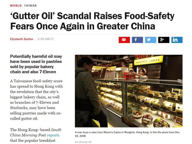《時代雜志》網絡版今天以“‘餿水油’丑聞再次于大中華地區引起食品安全恐慌”為題報道,發生在臺灣的食品安全恐慌已經散布到香港,香港最大的糕餅連鎖店以及7-Eleven、星巴克旗下連鎖店,可能都已經銷售了以俗稱為餿水油制造的糕點。
